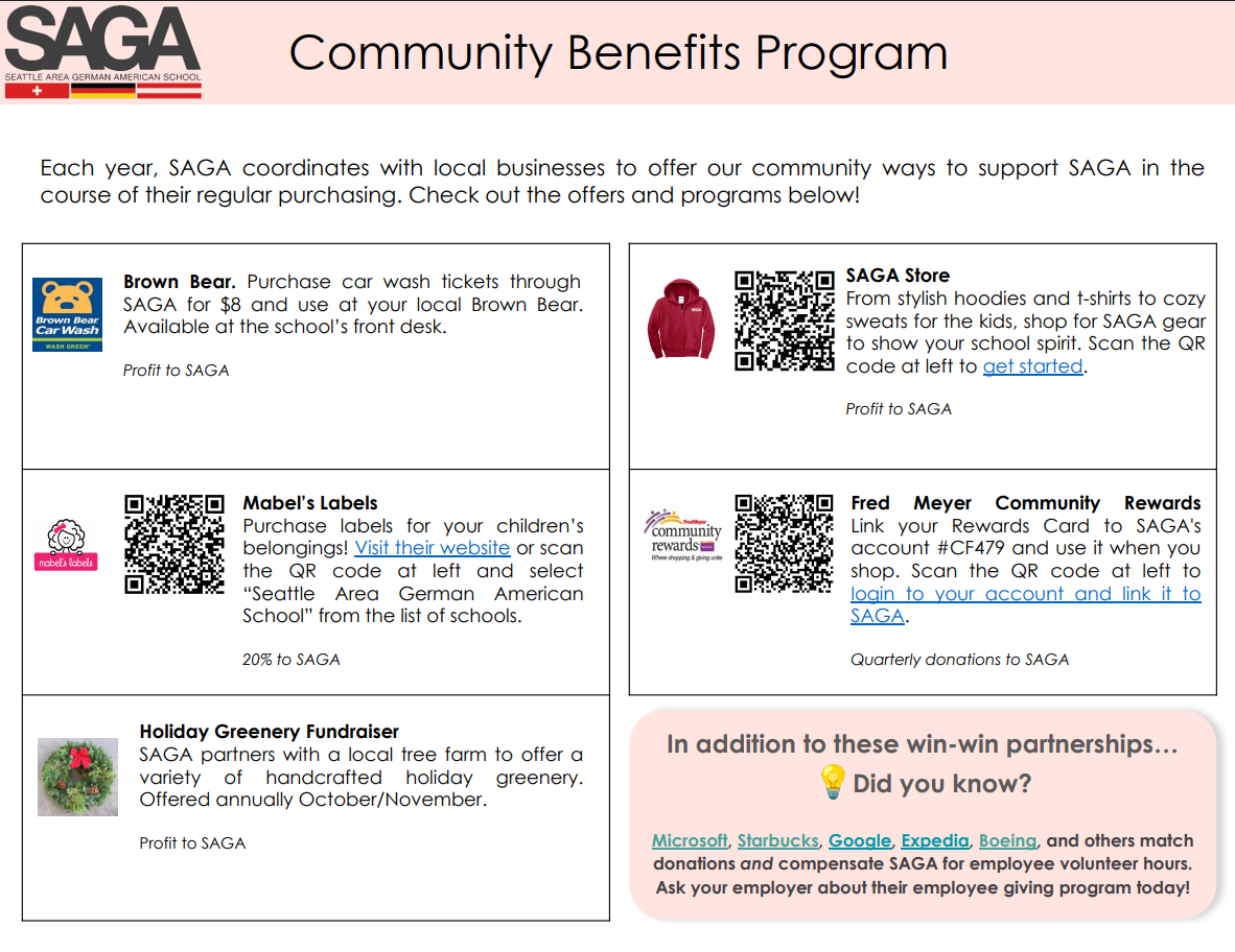 SAGA partners with local businesses to allow supporters to benefit the school all while making local, regular purchases! SAGA receives a portion of the proceeds. From gear labels and Fred Meyer Rewards to holiday greenery, learn more!